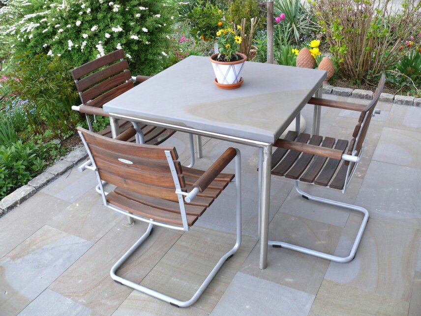 Als Tischplatte für einen Gartentisch, Küchenarbeitsplatte, Beistelltischplatte oder auch z. B. als Regalboden setzt die Lindlarer Grauwacke gestalterische Akzente.