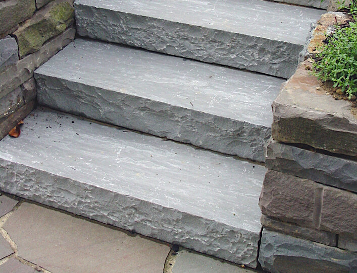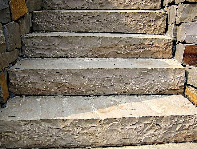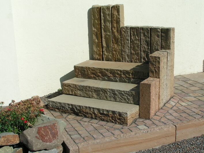 Blockstufen:Oberfläche spaltrauh, handbekantet/bossiert, ca. 14-16 cm stark, ca. 35 cm tief.