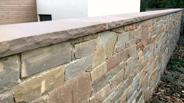 Als Mauerabdeckplatten setzt die Grauwacke Akzente und fügt sich harmonisch in die Gesamtgestaltung ein.